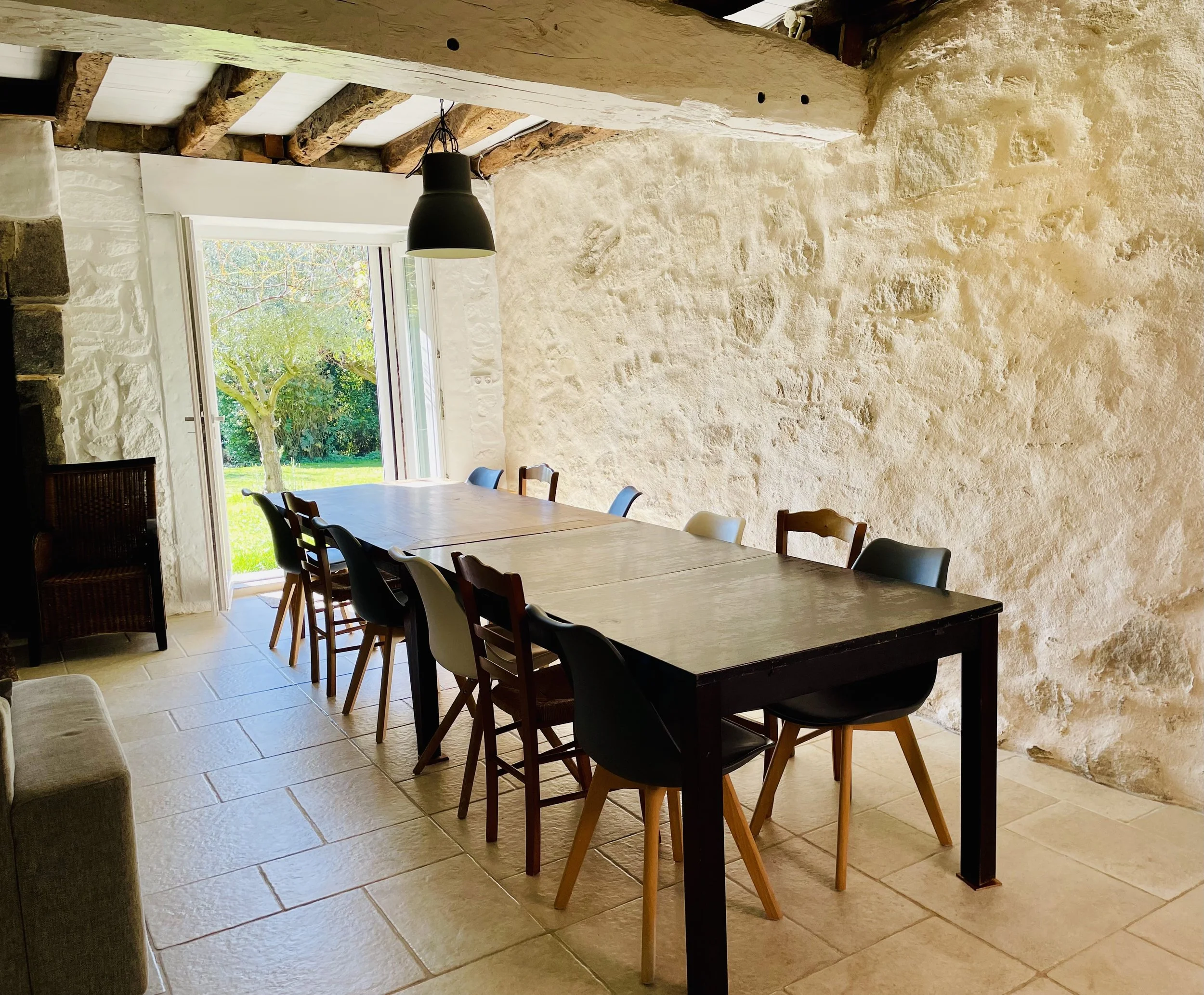 The farmhouse features a beautifully renovated living space with a fireplace and separate dining area. The area is spacious, perfect for groups and families.